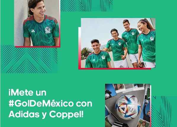 Hazte seguidor de las cuentas de Instagram de @coppel y @adidasmx. Haz un Gol de México realizando una compra mínima de $1,000.00 en productos Adidas entre el 4 y el 9 de octubre de 2022, la compra puede ser realizada en tiendas Coppel, en Coppel.com o en la App Coppel.