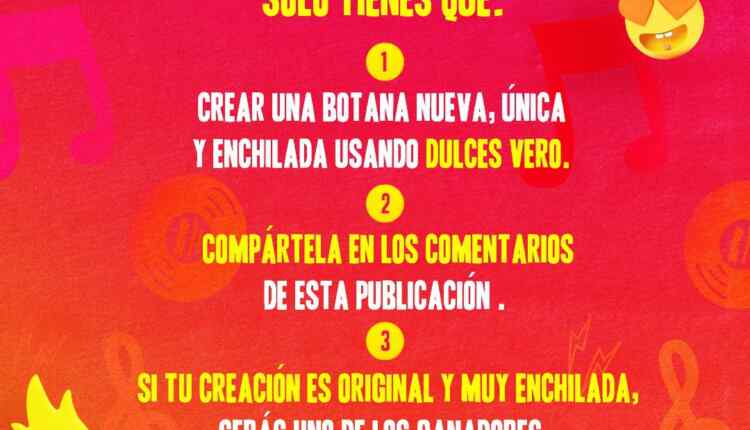 Podrán participar residentes legales de CDMX y Zona Metropolitana y Jalisco. Ingresa a la página de Facebook de Dulces Vero y dale like, realiza una receta de cocina, que consistirá en una lista de ingredientes necesarios, seguido de una serie de instrucciones para la elaboración de una botana única, enchilada y comestible, utilizando productos de Dulces Vero.