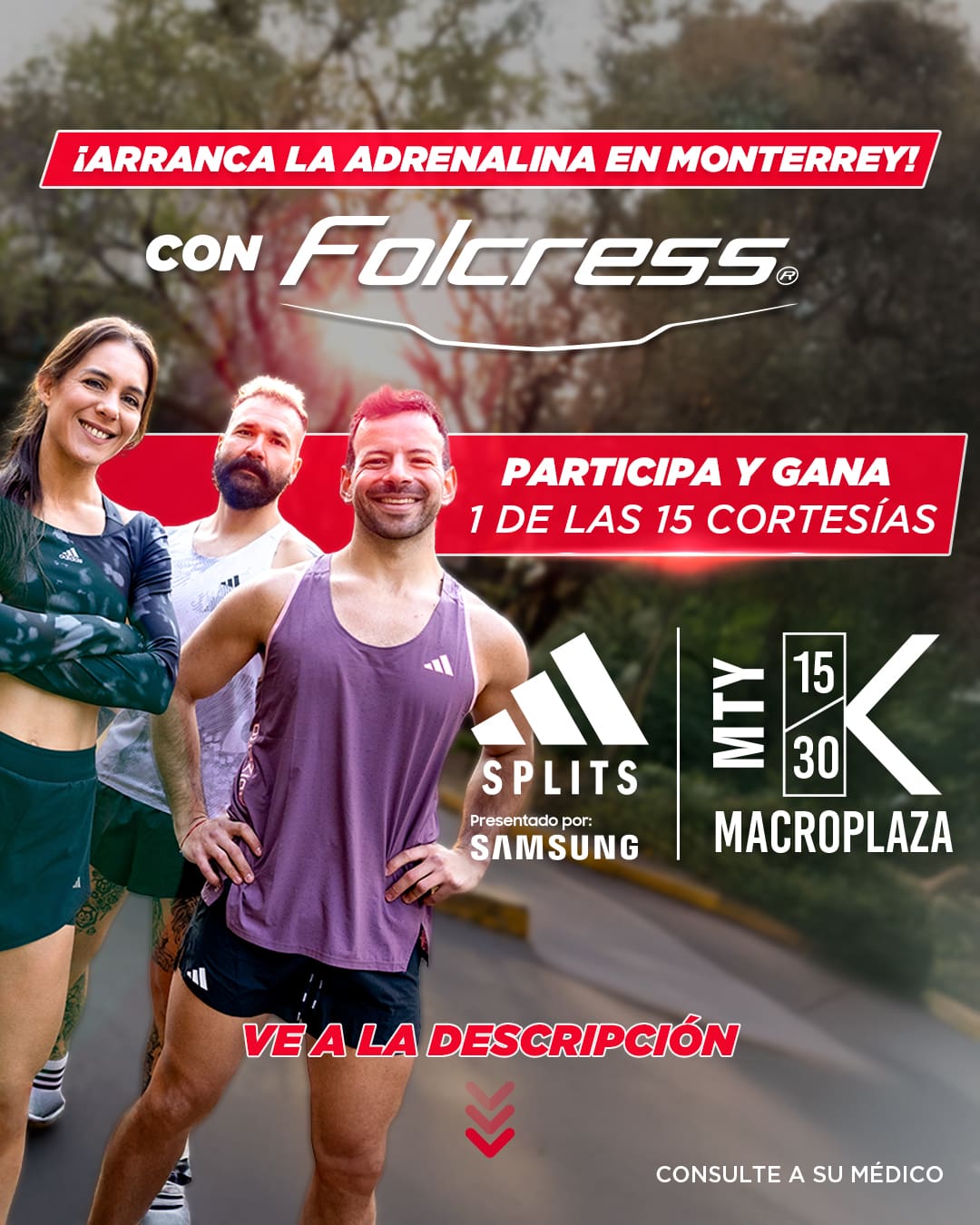 Folcress Grisi regalará a los participantes ganadores: Una cortesía para el adidas Split 15K/30K Macroplaza, Monterrey, que se llevará a cabo el 9 de noviembre de 2025.