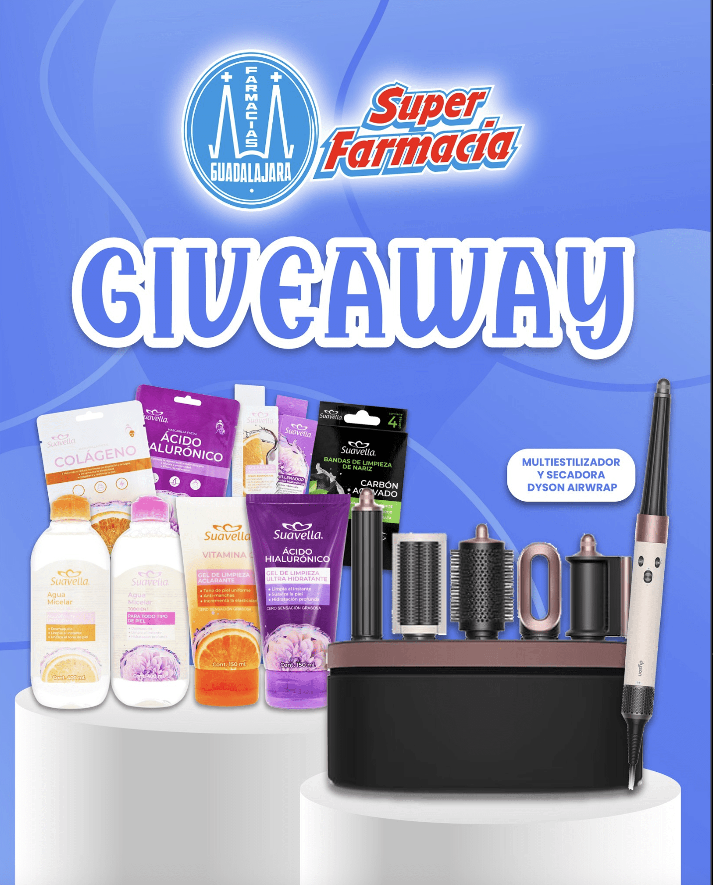 Farmacias Guadalajara regalará a los participantes ganadores: Un kit de productos Suavella y un multiestilizador y secadora Dyson.