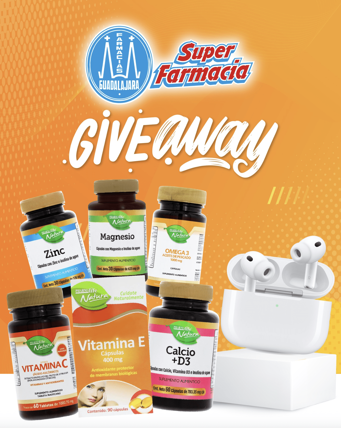 Farmacias Guadalajara regalará a los participantes ganadores: Suplementos Pharmalife y unos AirPods.