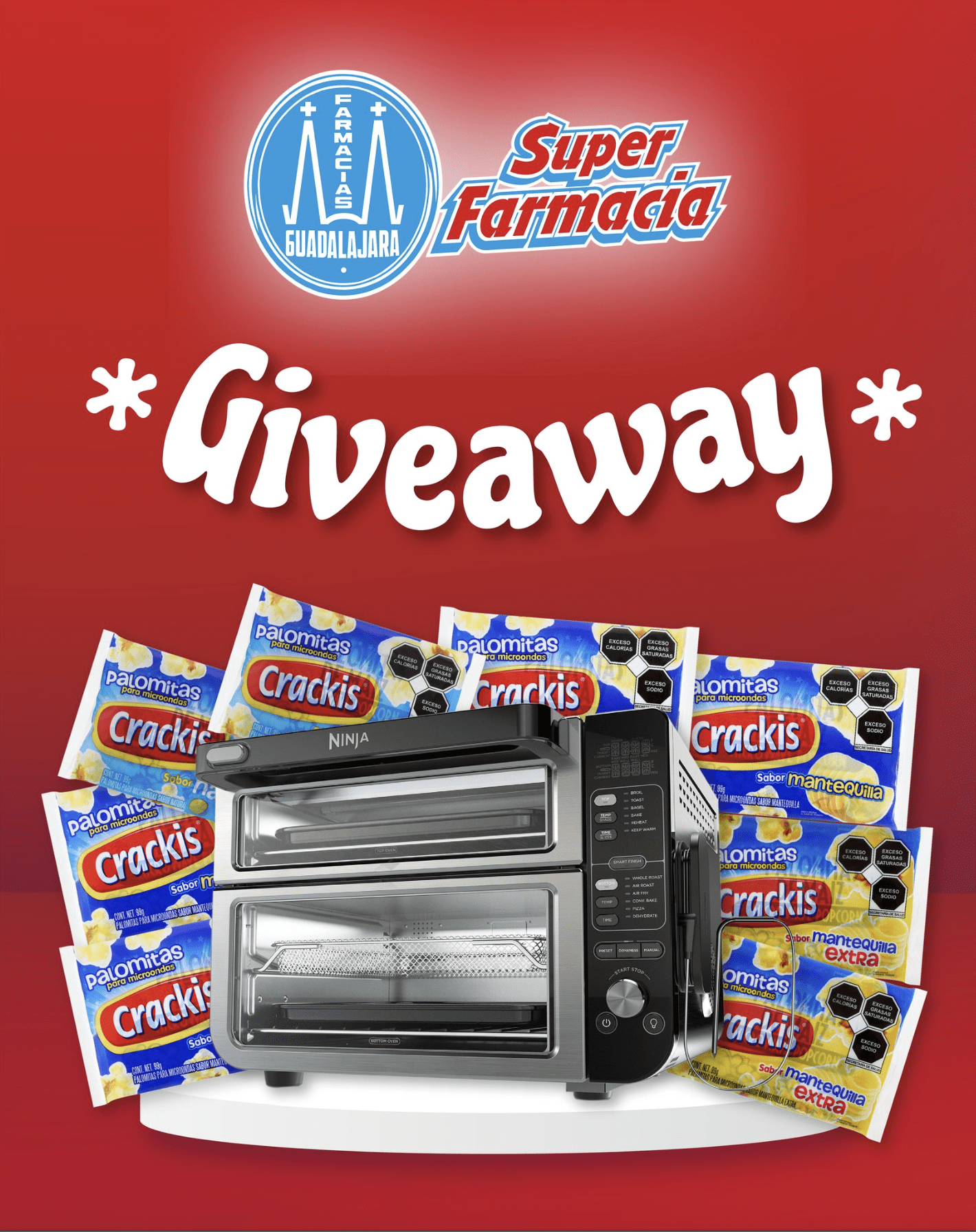Farmacias Guadalajara regalará a los participantes ganadores: Palomitas Crackis y un horno Ninja.