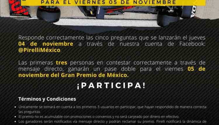 Pirelli regalará a los participantes ganadores: 1 de 3 pases dobles al GP de México de la Formula 1 (acceso para el viernes).