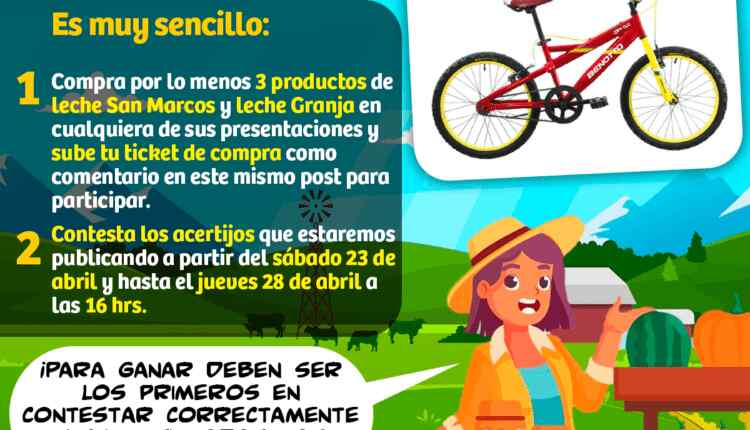 Podrán participar niños de 6 a 12 años, desde la cuenta de Facebook de sus papás, compra 3 productos de leche San Marcos y leche La Granja en cualquiera de sus presentaciones en Super Kompras entre el 23 y el 28 de abril de 2022 y conserva tu ticket de compra.