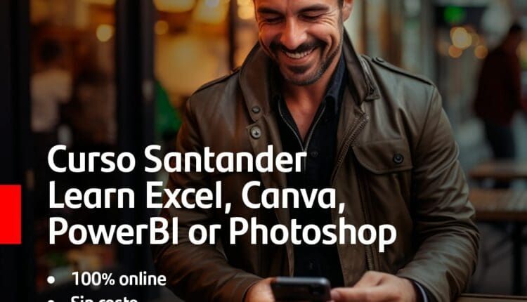 Banco Santander regalará 5,000 plazas para que puedas formarte a tu elección en uno de los 4 cursos disponibles de Excel, Canva, PowerBI o Photoshop. Disponibles en español, portugués e inglés. Los cursos son 100% online y no tienen costo para los beneficiarios. No es necesario contar con titulación universitaria ni ser cliente de Banco Santander.