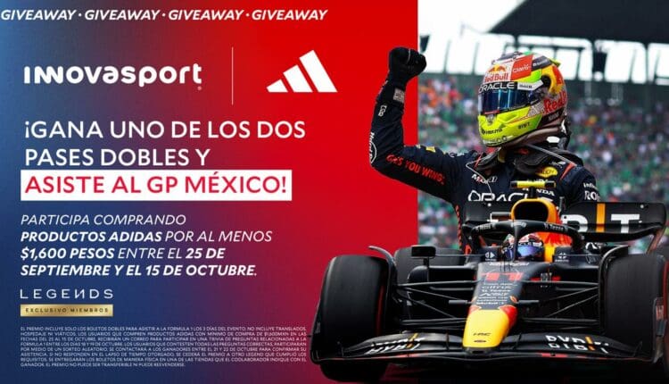 Innovasport y Adidas regalarán a los participantes ganadores: Un pñase doble para asistir al Gran Premio de México de la Formula 1 los 3 días del evento. NO incluye traslados, hospedaje, ni viáticos.