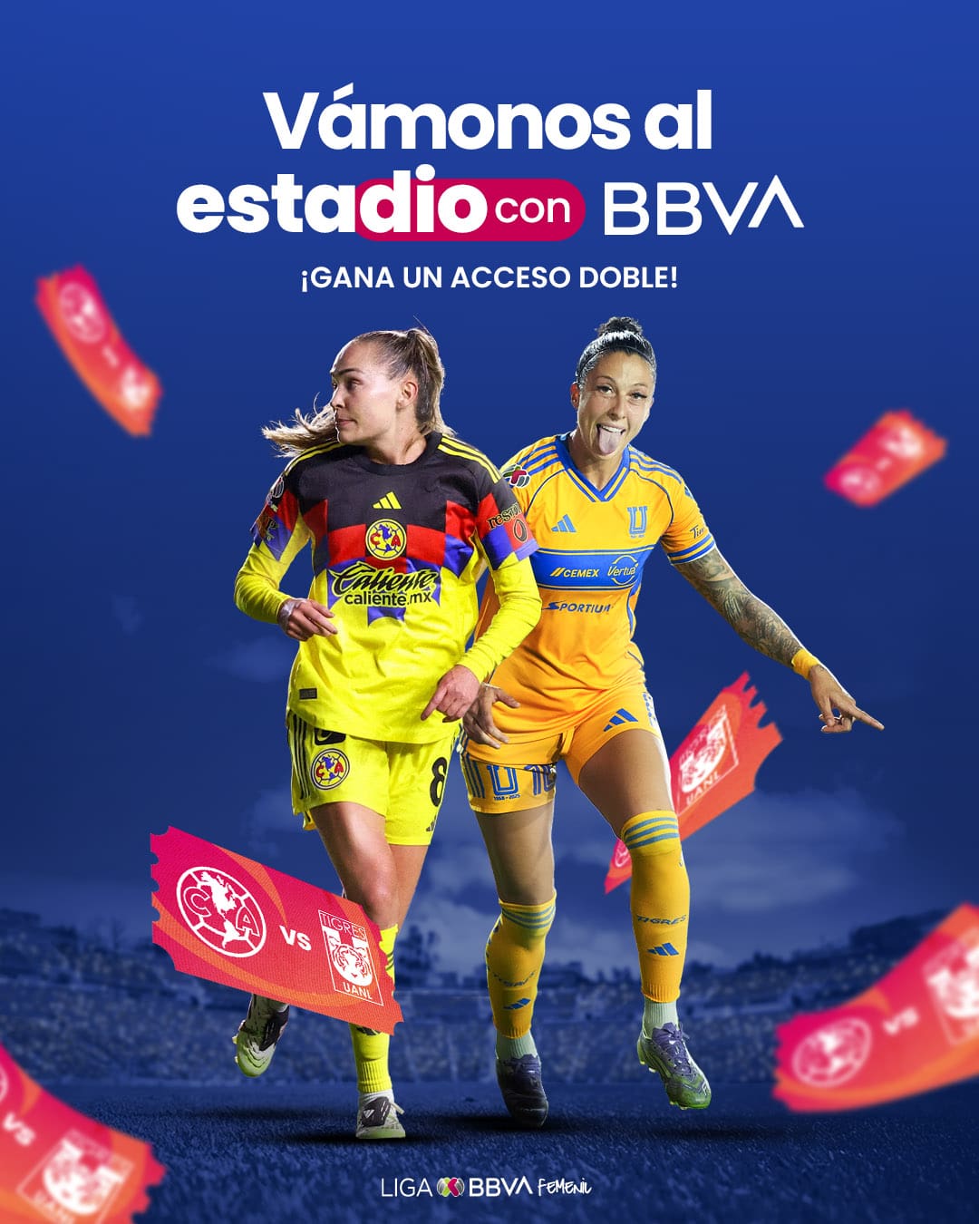 Liga BBVA Mx Femenil regalará a los participantes ganadores: Un acceso doble al partido de América vs Tigres de la Liga BBVA MX Femenil del Torneo Apertura 2025, que se celebrará el 10 de octubre de 2025 en el Estadio Ciudad de los Deportes a las 19:00 horas.