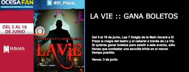 Este concurso de OCESA para el espectáculo La Vie es vigente hasta el 3 de junio de 2013.