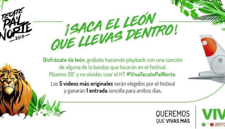 Disfrázate de león, grábate haciendo playback con una canción de alguna de las bandas que se presentaran en el Festival Pal Norte 2019, tu video deberá durar máximo 20 segundos, ubica la publicación del concurso y comparte tu video en los comentarios con el hashtag #VivaTecatePalNorte