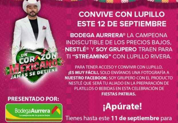 Bodega Aurrera, Nestlé y Soy Grupero te invitan a participar a su concurso en el que podrás ganar convivencias Virtuales con Lupillo Rivera, si quieres ser ganador realiza la mecánica siguiente: