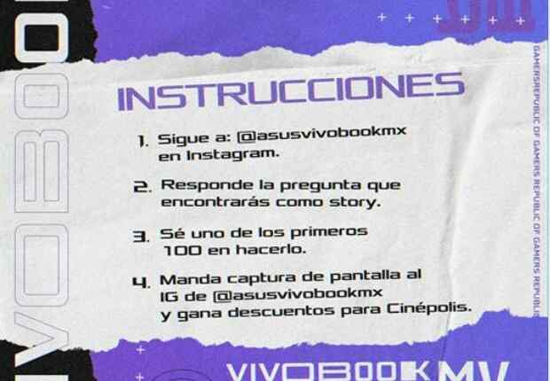 Hazte seguidor de la cuenta de Instagram de @AsusVivoBookMx, responde la pregunta que encontrarás en sus stories, toma captura de pantalla de dicha storie y postéala en tus historias etiquetando a @AsusVivoBookMx y a @AsusMx