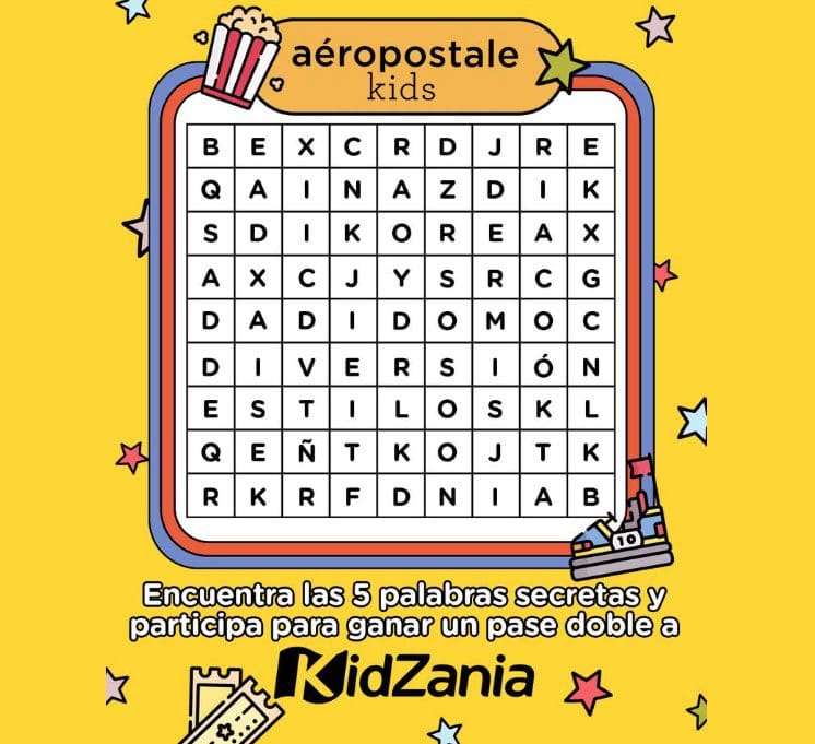 Ingresa a la página de Facebook de Aeropostale Kids mx y dale like, ubica la publicación del concurso, dale like y en los comentarios escribe las cinco palabras que veas dentro de la sopa de letras.