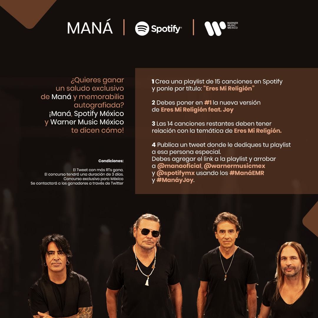 Publica un tweet donde le dediques tu playlist a tu persona especial, agrega el link de tu playlist, etiqueta a @ManaOficial, @WarmerMusicMex y @SpotifyMx y utiliza los hashtags #ManáEMR y #ManáyJoy.