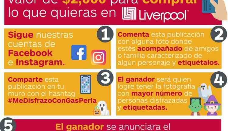 Hazte seguidor de las cuentas de Facebook e Instagram de Gas Perla, ubica la publicación del concurso, dale like, dale like y compártela en tu muro de forma pública utilizando el hashtag #MeDisfrazoConGasPerla para que el organizador pueda verificar que cumpliste con este paso