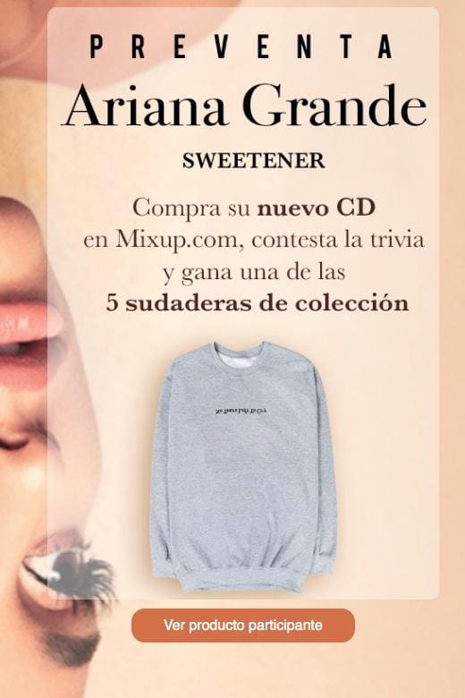 Adquiere el nuevo disco de Ariana Grande “Sweetener” en tiendas Mixup o en www.mixup.com y guarda tu ticket o número de pedido ya que de ser ganador te será solicitado para recoger tu premio.