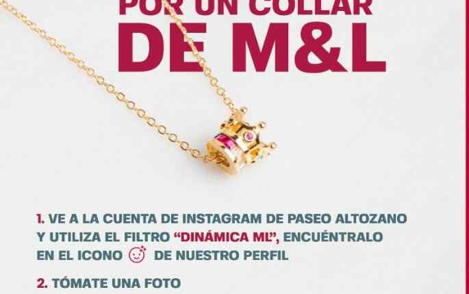 Visita la cuenta de Instagram de Paseo Altozano y busca el filtro de la Dinámica M&L, tómate una foto usándolo, compártela en los comentarios de la publicación del concurso y etiqueta a M&L JOYAS.