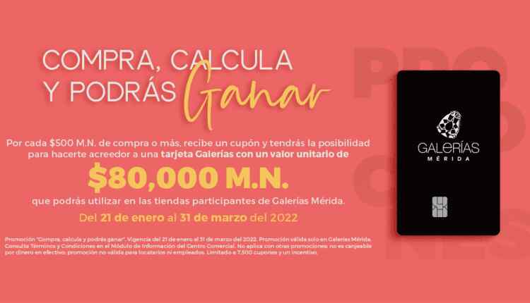 Deberás conservar el cupón de participación y el ticket original de compra correspondiente para poder reclamar tu premio en caso de ser ganador y deberás depositar la otra mitad del cupón en la urna que se encuentra en el Módulo de Atención y Servicio del Centro Comercial Galerías Mérida. El participante que acierte el número exacto o se acerque más sin pasarse será el ganador.
