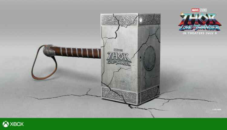 • Una consola y controlador Xbox Series X de diseño personalizado con ilustraciones de Thor: Love and Thunder.