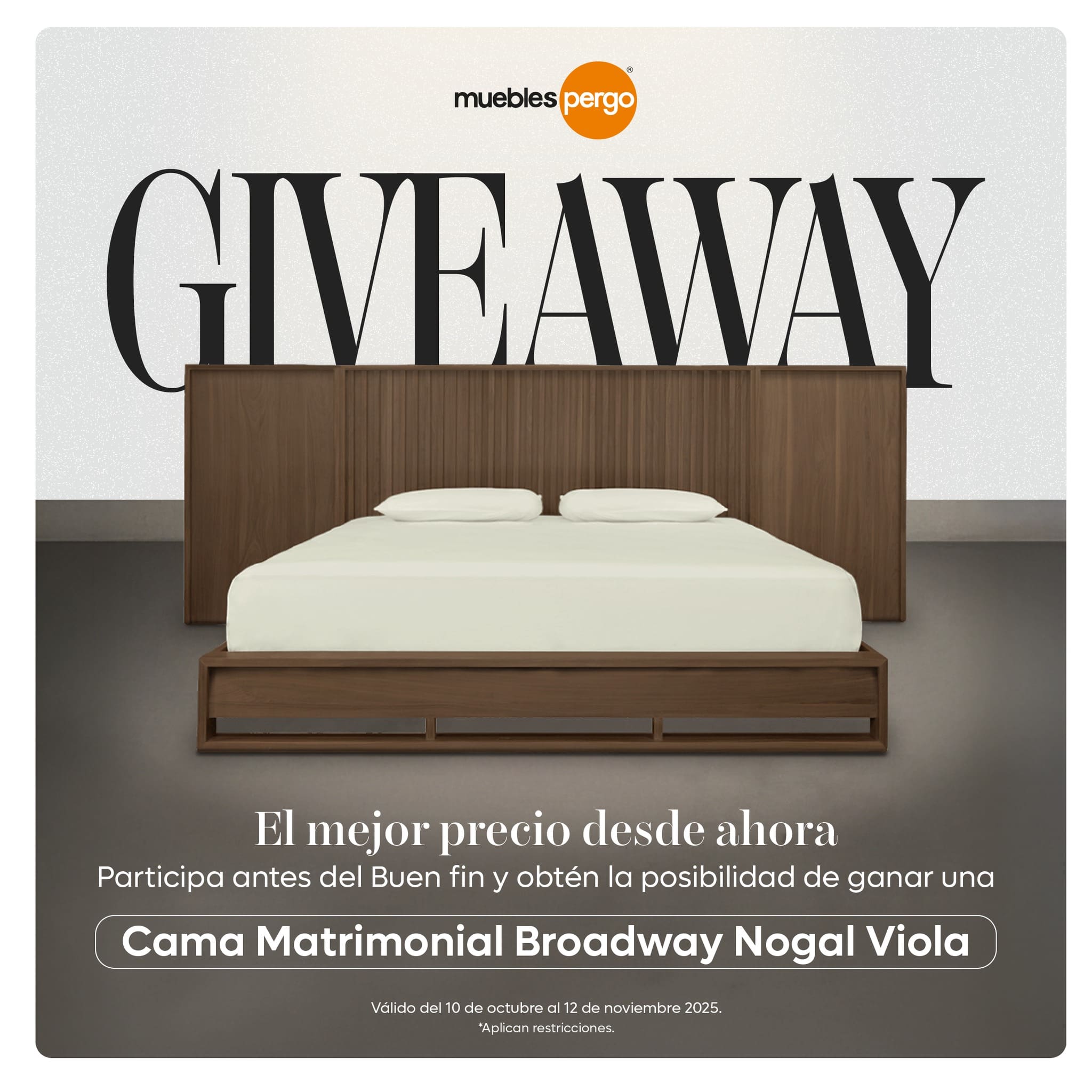 Muebles Pergo te invita a participar a su concurso Buen Fin 2025 en el que podrás ganar una Cama Matrimonial Broadway Nogal Viola, si quieres ser ganador realiza la mecánica siguiente:
