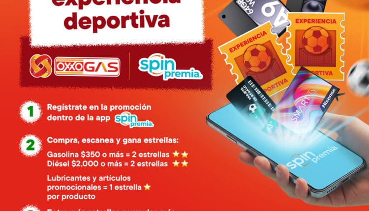 Regístrate en la promoción “Experiencia Deportiva” en la app Spin Premia, carga gasolina, diesel o compra artículos promocionales entre el 1 de marzo y el 15 de abril de 2026 en Gasolineras Oxxo Gas.