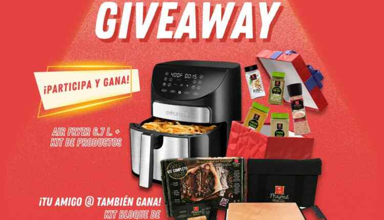 Pragná regalará al participante ganador: Una freidora de aire Gourmia 6.7 litros junto con un kit de productos Pragná y un kit bloque sal del Himalaya Pragná para su amigo etiquetado.