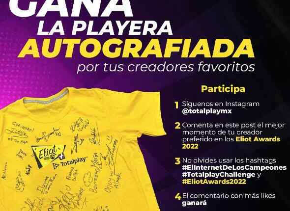 Totalplay te invita a participar a su concurso en el que podrás ganar una playera autografiada de los Eliot Awards 2022, si quieres ser ganador realiza la mecánica siguiente: