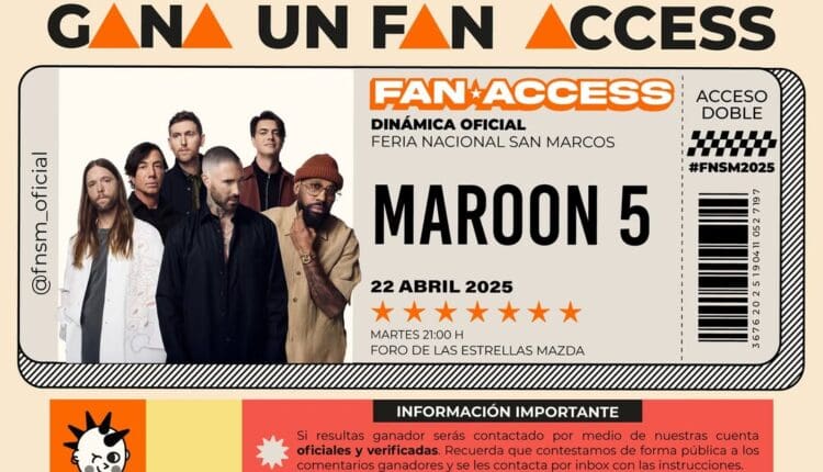 Feria Nacional de San Marcos regalará a los participantes ganadores: Un Fan Access Maroon 5, para el martes 22 de abril de 2025 en el Foro de las Estrellas Mazda.