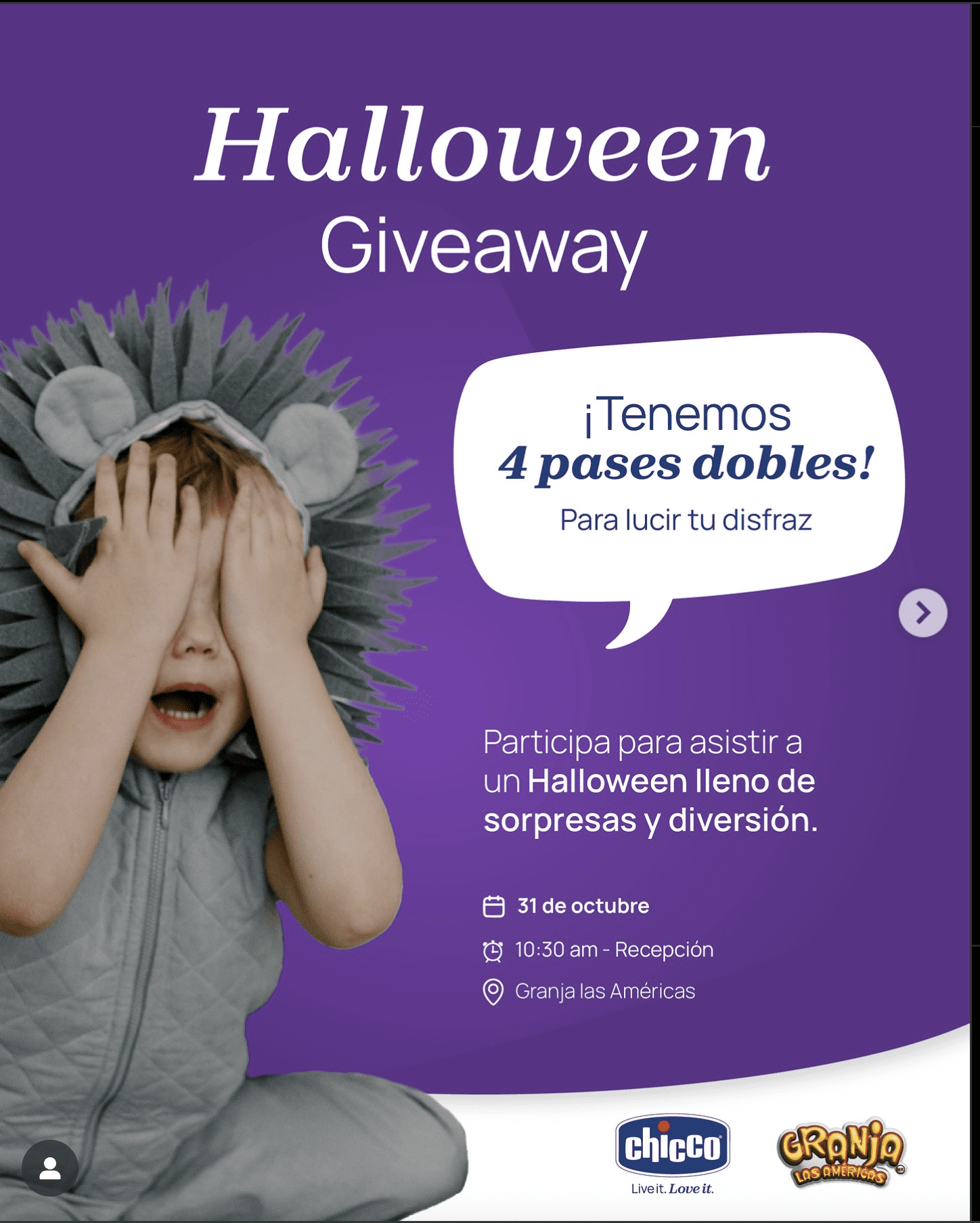 Hazte seguidor de las cuentas de Instagram de @chiccomx y @granjamex, ubica la publicación del concurso, dale like y en la sección de comentarios cuenta cuál es el disfraz favorito de tu peque.