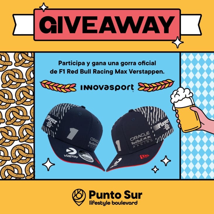 Punto Sur Guadalajara te invita a participar a suconcurso en el que podrás ganar 1 de 2 gorras de la F1 Red Bull Racing de Max Verstappen, si quieres ser ganador realiza la mecánica siguiente: