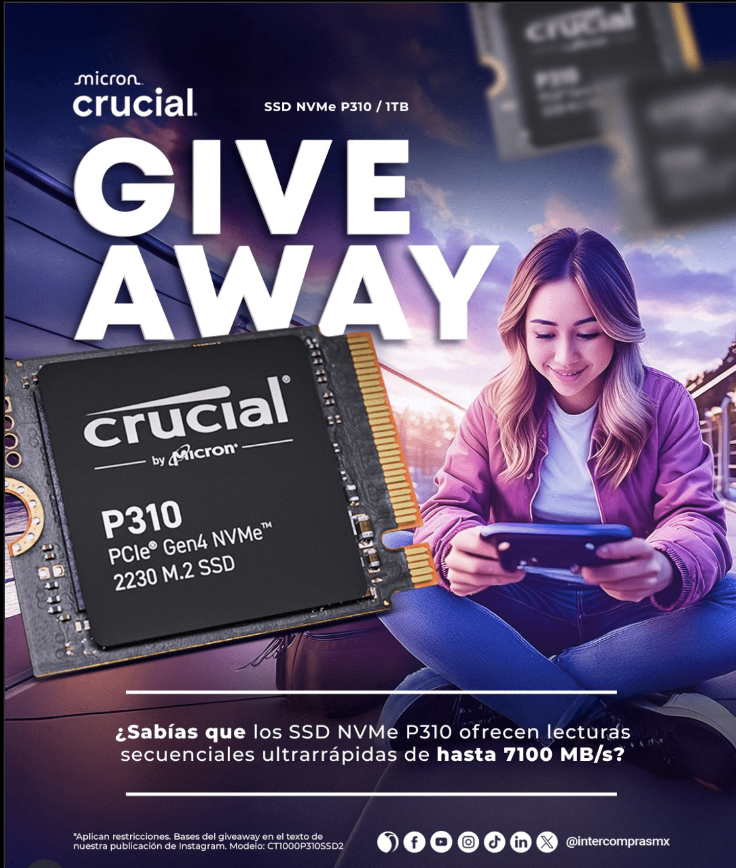 Intercompras regalará al participante ganador: UnaSSD Crucial P310 de 1TB PCIe Gen4 NVMe con valor de $1,670.00.