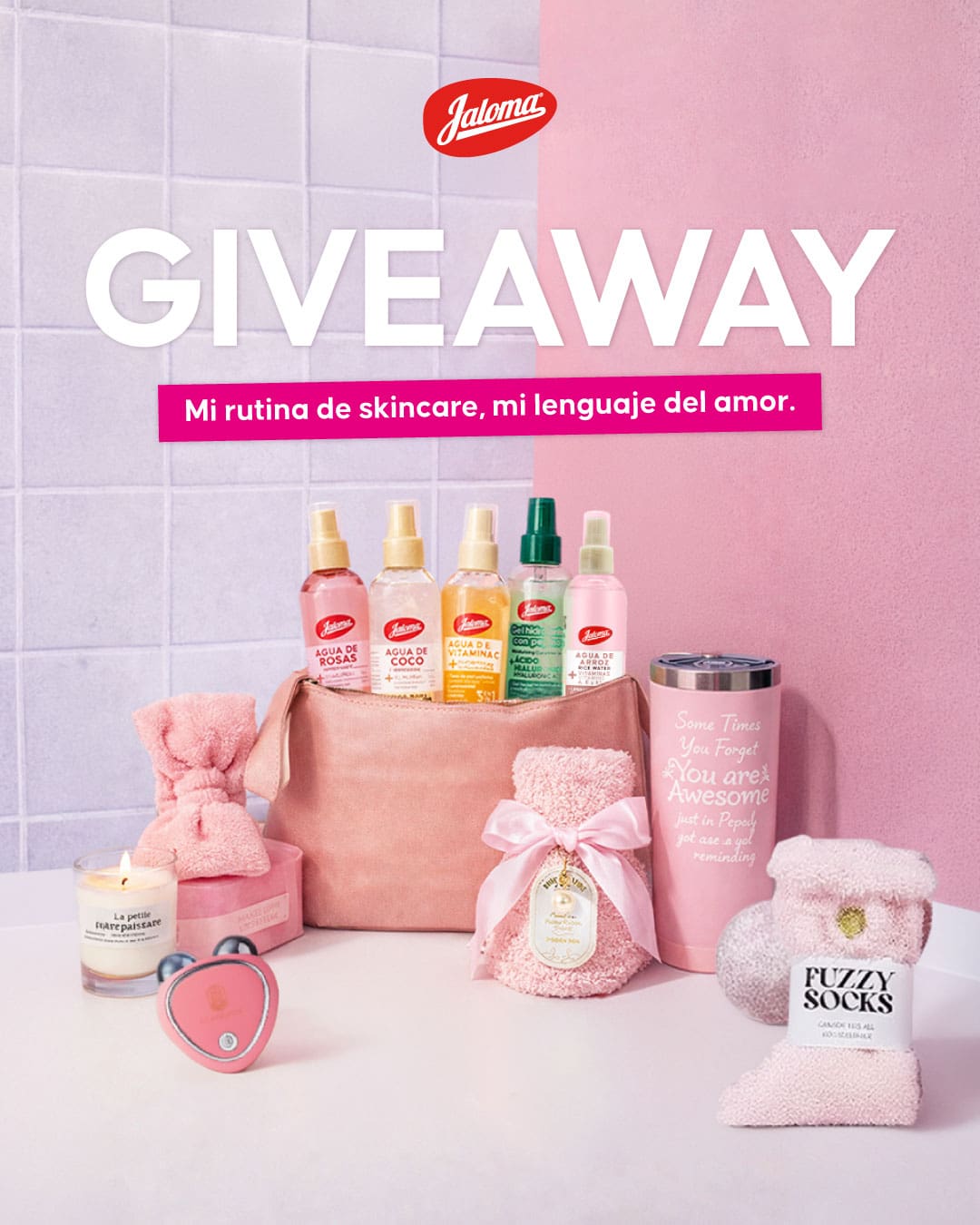 Jaloma regalará a los participantes ganadores: Un kit Jaloma que incluye agua de rosas, agua de coco, agua de arroz, agua de vitamina C, gel hidratante de pepino, un set de cuidado personal y un masajeador de microcorriente facial.
