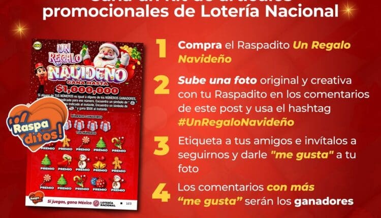 Compra el Raspadito “Un Regalo Navideño” en tu punto de venta más cercano. Ingresa a la página de Facebook de Lotería Nacional y dale like, tómate una foto con tu Raspadito y compártela en los comentarios de la publicación del concurso usando el hashtag #UnRegaloNavideño.