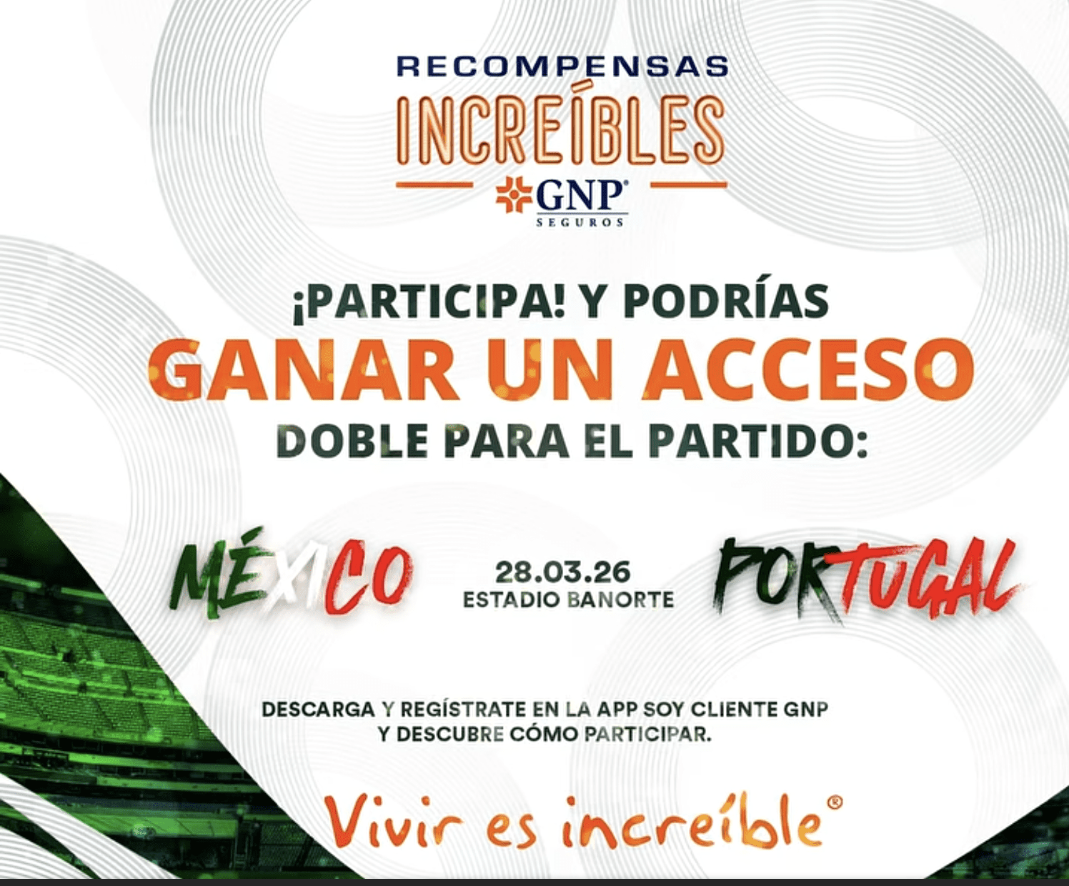 GNP Seguros te invita a participar a su concurso en el que podrás ganar boletos dobles para ir al partido de México vs Portugal, si quieres ser ganador realiza la mecánica siguiente: