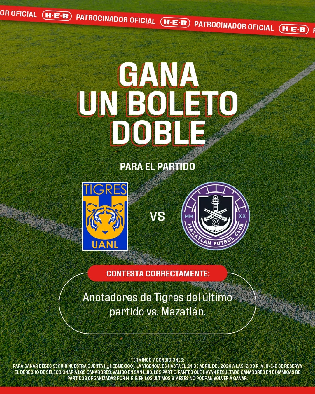 HEB México regalará a los participantes ganadores: Un pase doble al partido de Tigres vs Mazatlán.