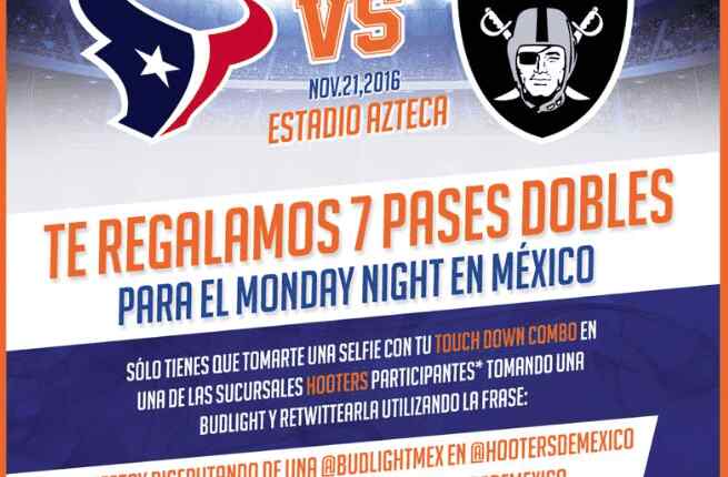 Hooters regalara a 7 participantes ganadores un pase doble para asistir al Monday Night Football este 21 de Noviembre del 2016 en el Estadio Azteca erre Texans-Rairders.