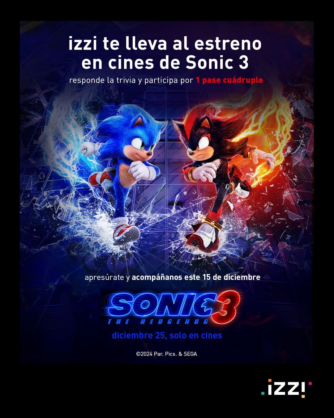 Izzi Telecom regalará a los participantes ganadores: Un pase cuádruple para la premiere de Sonic 3 La Película, función especial para toda la familia en la que podrán conocer a Luisito Comunica, la voz de Sonic, desde la alfombra roja.