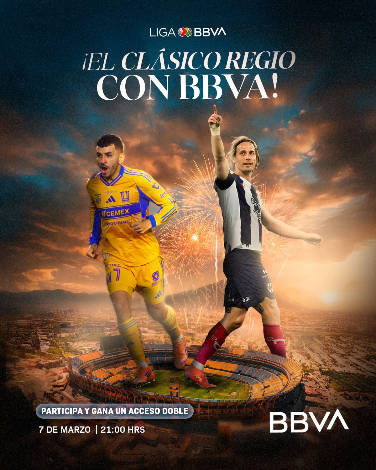 Liga BBVA Mx regalará a los participantes ganadores: Un acceso doble al partido de Tigres vs Monterrey de la Liga BBVA MX del Torneo Clausura 2026, que se celebrará el 7 de marzo de 2026 en el Estadio Universitario a las 21:00 horas.