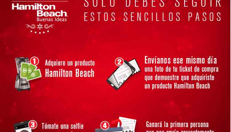 Ingresa a la página de Facebook de Hamilton Beach México y dale like, compra cualquier producto Hamilton Beach entre el 12 de Diciembre del 2016 y el 6 de Enero del 2017 y guarda tu ticket de compra, de resultar ganador te será solicitado.