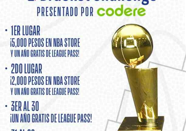 NBA México te invita a participar a su concurso Bracket Challenge 2020 en el que podrás ganar $5,000 Pesos en NBATienda.com, suscripción NBA League Pass y más, si quieres ser ganador realiza la mecánica siguiente: