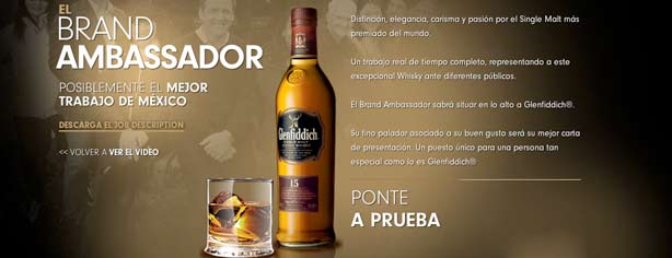 - Whisky Glenfiddich, el whisky puro de malta más premiado del mundo, te invita a participar en su promoción Glenfiddich Brand Ambassador donde podrás trabajar como promotor internacional de Glenfiddich.