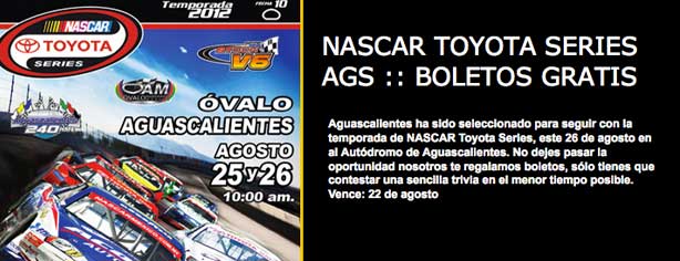 - Con este concurso de OCESA podrás ganar boletos para asistir a la Nascar Toyota Series que se llevará a cabo en el Autódromo de Aguascalientes el próximo 26 de agosto.
