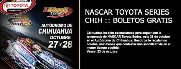 - Con este concurso de OCESA podrás ganar boletos para asistir a la Nascar Toyota Series que se llevará a cabo en el Autódromo de Chihuahua el próximo 28 de octubre.