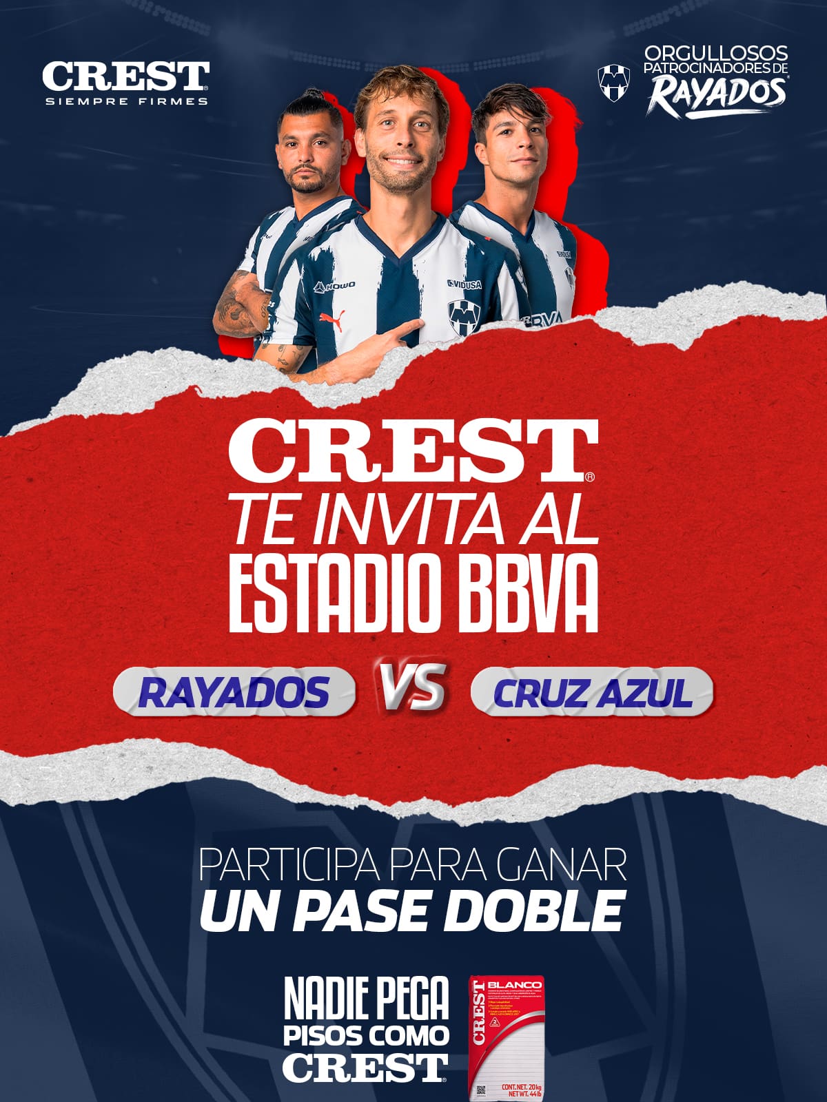 CREST Mexico regalará a los participantes ganadores: Un pase doble para asistir al partido de Rayados vs Cruz Azul este 28 de febrero de 2026 en el Estadio BBVA.