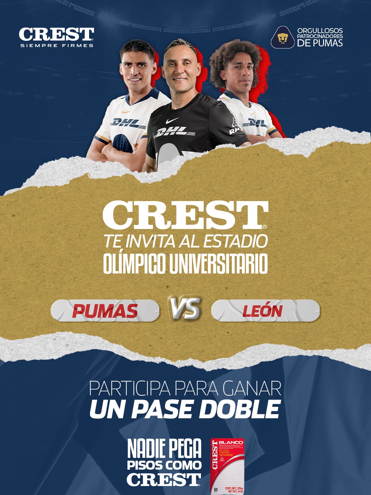 CREST Mexico regalará a los participantes ganadores: Un pase doble para asistir al partido de Pumas vs León este 18 de enero de 2026 en el Estadio Olímpico Universitario.