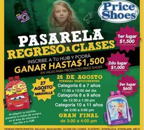 Adquiere una mochila en Price Shoes entre el 3 y el 26 de Agosto del 2017, una vez que tengas tu ticket de compra preséntate en el área de informes e inscribe a tu hijo en la pasarela Price Shoes en alguna de las categorías participantes: