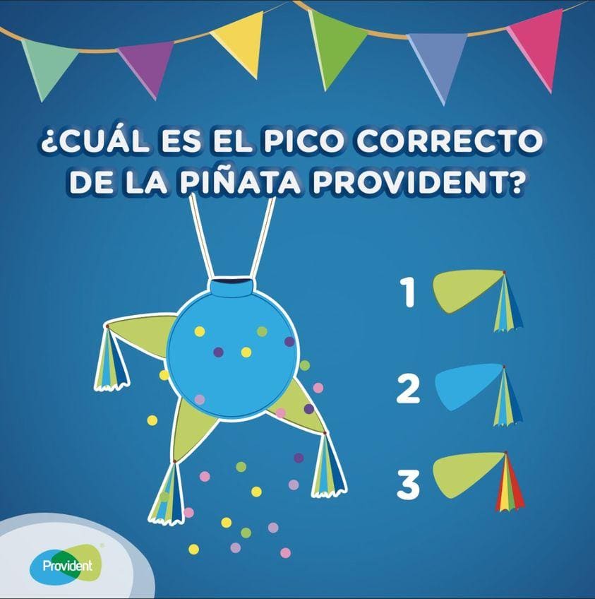 Ingresa a la página de Facebook de Provident y dale like, ubica la publicación del concurso, dale like y en la sección de comentarios menciona cuál es el pico que completa de manera simétrica y en su tonalidad la piñata navideña Provident.