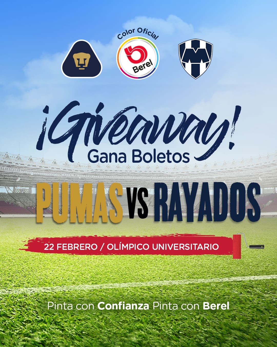 Pinturas Berel regalará a los participantes ganadores: Un pase doble al partido de Pumas vs Rayados, en el Estadio Olímpico Universitario, CDMX, este 22 de febrero de 2026.