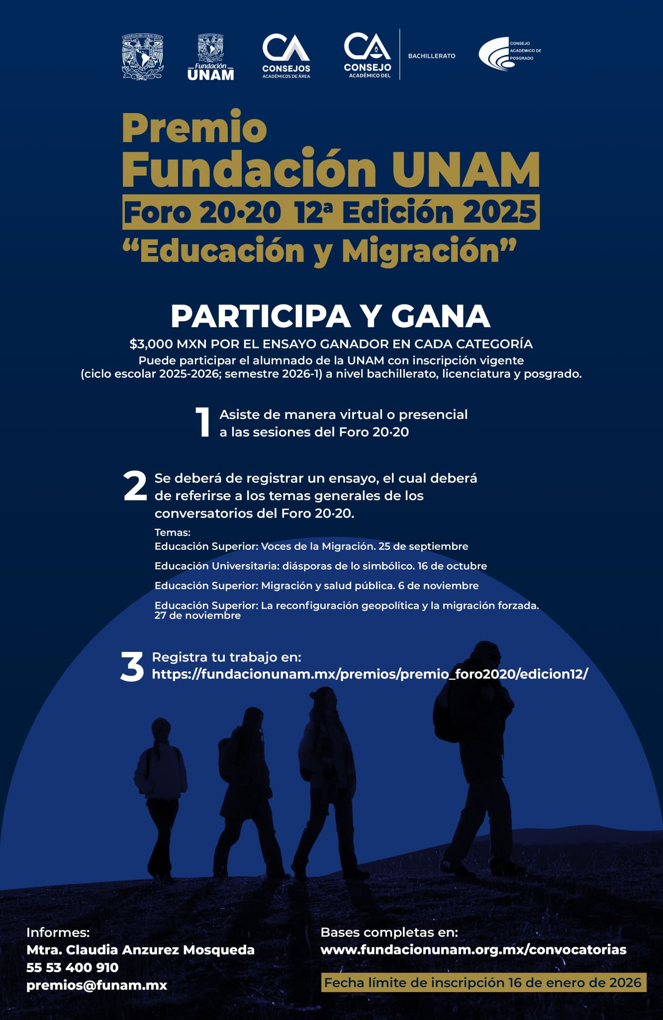 Fundación UNAM te invita a participar a su concurso Foro 20.20 Edición, 2025 “Educación y Migración” en el que podrás ganar $3,000.00 y un libro, si quieres ser ganador realiza la mecánica siguiente: