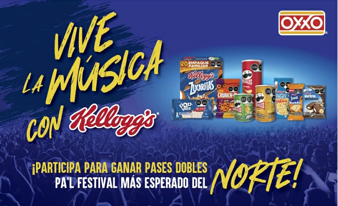 Regístrate a la dinámica “!Gana pases dobles pal concierto más esperado del Norte!” desde la app de Mi Oxxo, ve al Oxxo de tu preferencia y compra productos Kellogg’s, Pringles, Crunch It y Cheez it participantes.