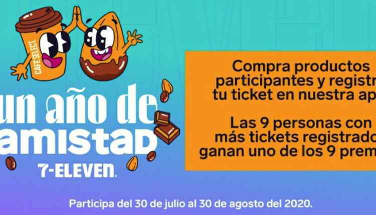 Realiza una compra de Café Select y/o almendras con chocolate 7-Select en tiendas 7-Eleven entre el 30 de julio y el 30 de agosto de 2020 y conserva tu ticket de compra. Descarga la App 7-Eleven México registra tus datos y pulsa en la sección Un Año de Amistad, completa la información y acepta los términos y condiciones.